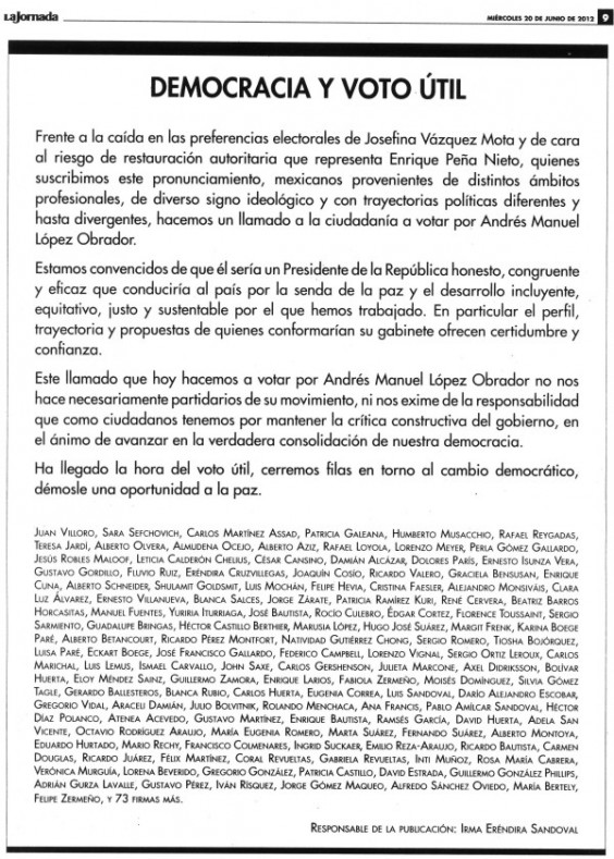 “Frente a la caída en las preferencias electorales de Josefina Vázquez Mota y de cara al riesgo de restauración autoritaria que representa Enrique Peña Nieto, quienes suscribimos este pronunciamiento, mexicanos provenientes de distintos ámbitos profesionales, de diverso signo ideológico y con trayectorias políticas diferentes y hasta divergentes, hacemos un llamado a la ciudadanía a votar por Andrés Manuel López Obrador.
