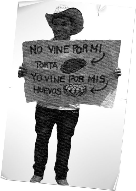 “No vine por mi torta, vine por mis huevos”, señala de modo paródico el acarreo y en contraparte, la irreductible voluntad individual del mexicano con la coloquial figura poética “mis huevos”.