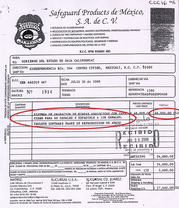 El primer documento –factura número 1914, de fecha 30 de julio de 2008– detalla la compra de un sistema de grabación de líneas telefónicas analógicas con capacidad de 60 canales, expandible a 128, y su programa de reproducción de audio, con un costo de 48 mil dólares, de los cuales en esa momento el gobierno de Baja California pagó 27 mil.