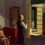 Tampoco habitación ni escena, por tanto, de la que como espectadores no alcancemos a tomar parte, ya sea atisbándola a vista de pájaro –como la de los que sobrevolaran esas masas de edificios neoyorquinos aislados que pintara Hopper–, ya yendo a pie –como lo hiciera el flâneur baudeleriano que recorriera las calles parisinas a finales del XIX– (y que él mismo también recorrió en sus tres viajes a París), ya como pasajero. Desde uno de esos trenes ligeros que el pintor tomaba para ir de una parte a otra de la ciudad de Nueva York, –donde tenía establecido su estudio–, podía ver, como un voyeaur sobre raíles, escenas íntimas, escenas que al pasar en movimiento frente a ellas se volvían familiares a la vez que extrañas. Familiares por prosaicas y cotidianas; extrañas porque no daba tiempo más que a verlas durante un instante fugaz. Porque no daba lugar a familiarizarse con ellas. Porque era escaso el tiempo en el que se podía participar de las mismas.