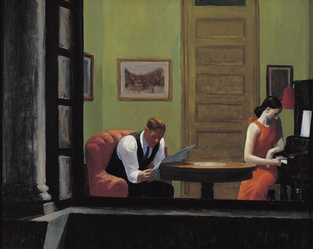 Bien podría ser una misma esa voluptuosa mujer que se vuelve a la espera de que el oficinista se fije en sus curvas en Oficina de noche (1940), o esa otra pulsando una tecla del piano mientras su marido lee el periódico haciéndole caso omiso en Habitación en Nueva York (1932). Pero los personajes de Hopper son personajes desconocidos, de rasgos poco definidos, con nombre y apellidos propios, sí, pero, como afirma Carlos Marzal “personajes de paso, al fin y al cabo, de paso por esas estancias, de paso por la ciudad, de paso por el mundo, de paso por sus vidas, camino quién sabe dónde”. ¡Cómo vamos a reconocerlos del todo!