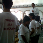 DURANGO, Dgo. (apro).- Integrantes del movimiento #YoSoy132 irrumpieron este viernes un una conferencia que impartía el expresidente Vicente Fox Quesada, a quien calificaron de “traidor” a la democracia”, mediante rótulos impresos en sus playeras.