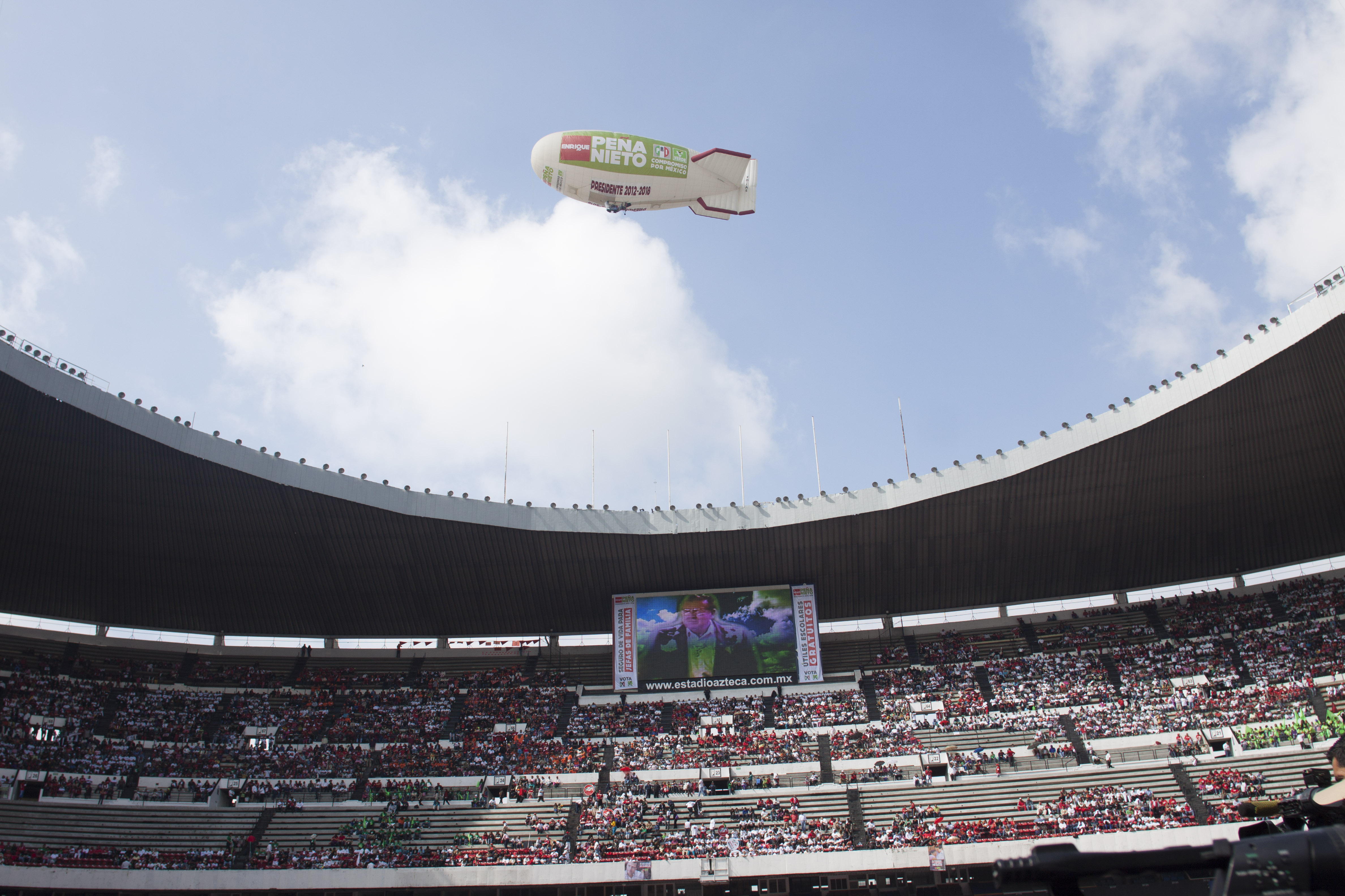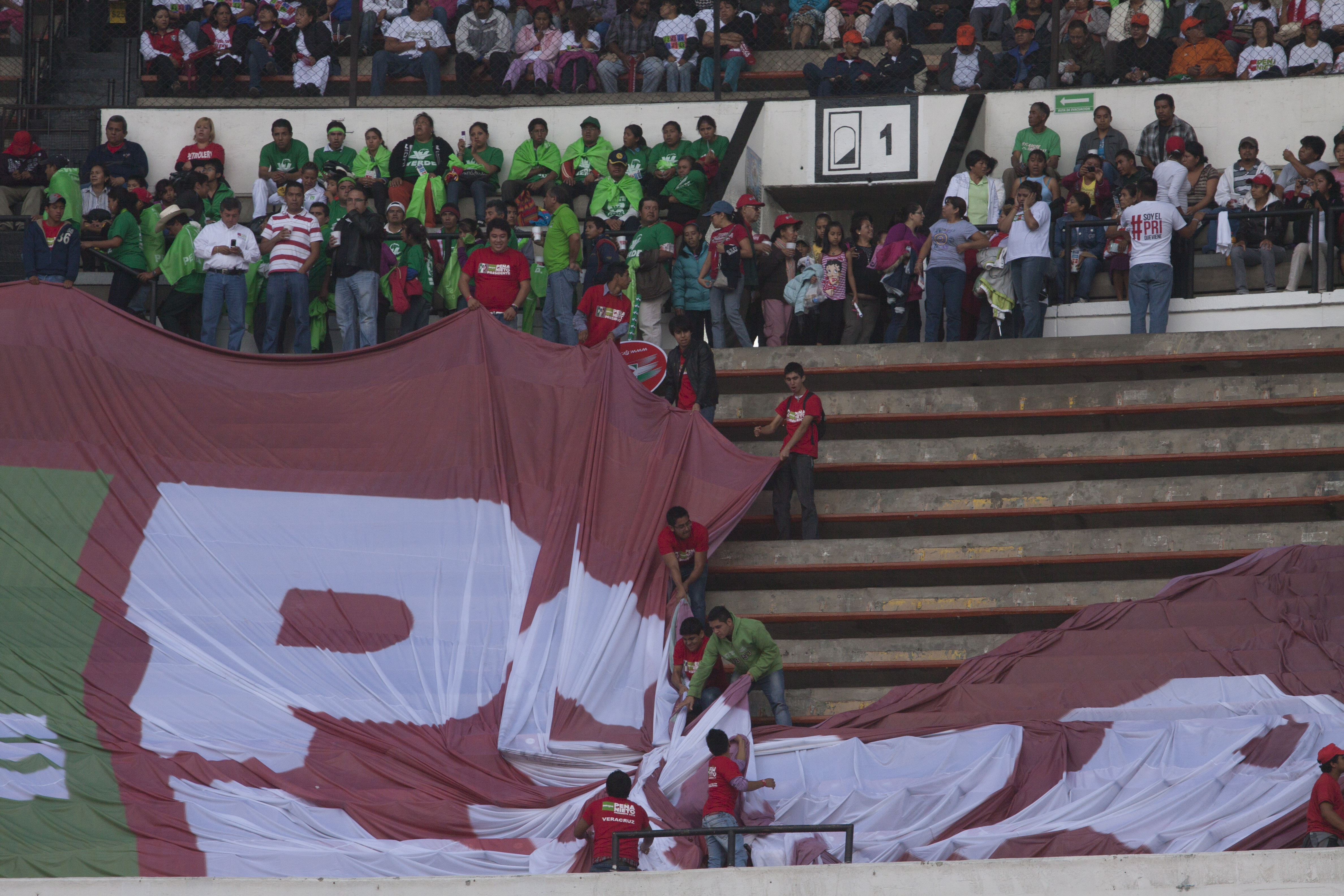 Los aplausos, las matracas, un enorme globo aerostático y las porras al mejor estilo del partido con más de 80 años en el poder, no pudo ocultar que el aparato priista no pudo abarrotar este estadio, propiedad de Grupo Televisa, con un cupo para más de 125 mil personas. Los cálculos extraoficiales mencionaron que hubo entre 80 mil y 100 mil personas.