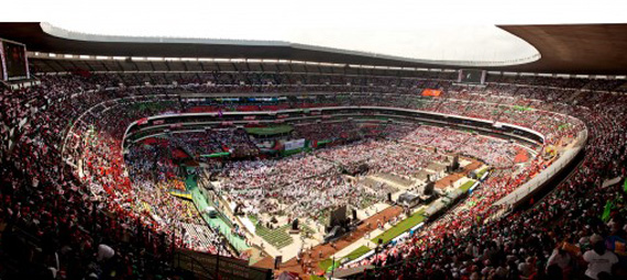 MÉXICO, D.F. (apro).- “Juntos vamos a dejar atrás las prácticas de la vieja política”, arengó el candidato presidencial del PRI-PVEM, Enrique Peña Nieto, en el cierre de su campaña en el Estadio Azteca, un coloso que las fuerzas priistas no alcanzaron a llenar, a pesar de esa acendrada costumbre del “acarreo” tricolor que se observó desde las 8:30 de la mañana, con más de mil 600 camiones provenientes de distintas entidades.