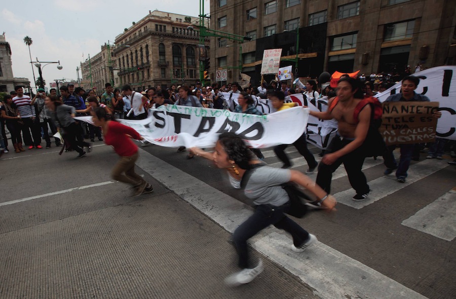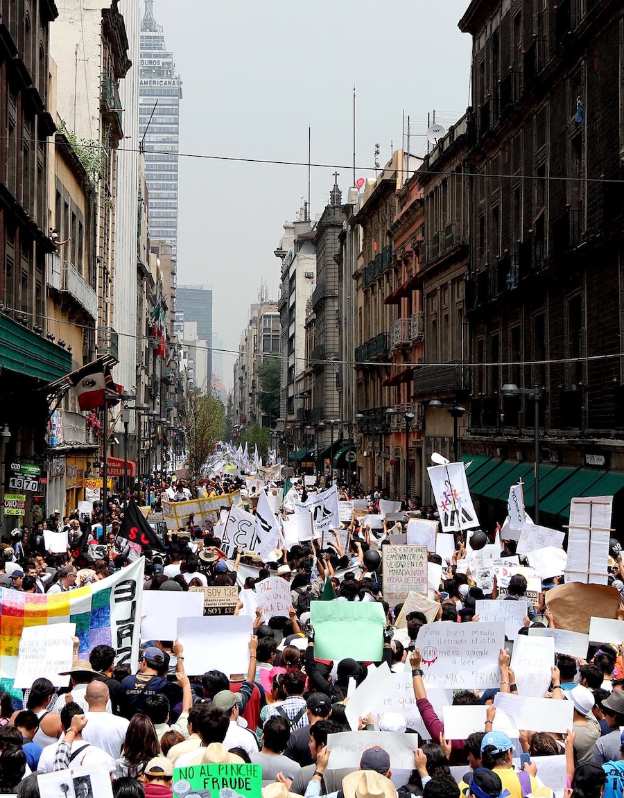 MÉXICO, D.F. (apro).- Con pocos minutos de diferencia al cierre del candidato presidencial priista en el Estadio Azteca, en las calles del Centro Histórico y en el Paseo de la Reforma miles de jóvenes y ciudadanos protagonizaron la tercera marcha anti-Peña Nieto realizada en la Ciudad de México.