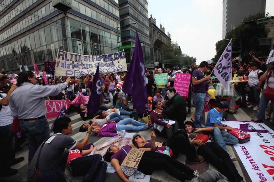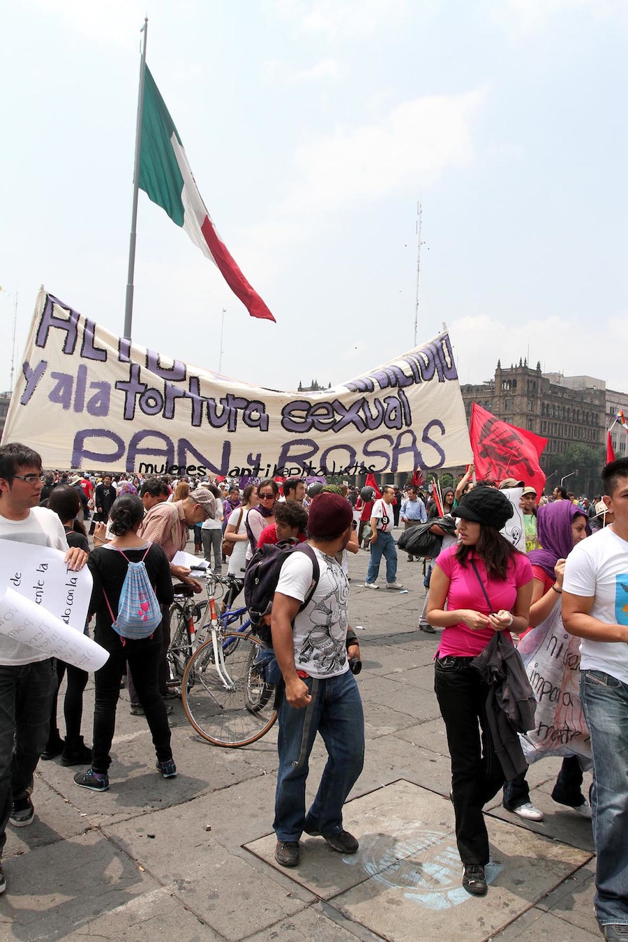 Simpatizantes de la candidata a senadora del PAN, Rosi Orozco, fueron echados de la marcha con el grito de “¡fuera, fuera!”, mientras un contingente de decenas de jóvenes portaban un cartelón con la frase “Alto al feminicidio y a la tortura sexual”.