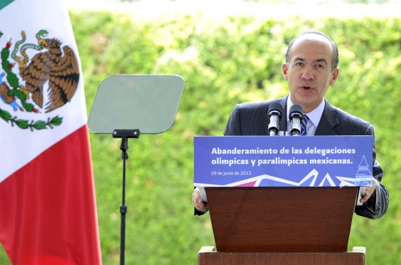 MÉXICO, D.F., 29JUNIO2012.- Felipe Calderón Hinojosa, presidente de México, abanderó en la sede ofical de Los Pinos a la delegación mexicana que pareticipará en los Juegos Olimpicos de Londres 2012.