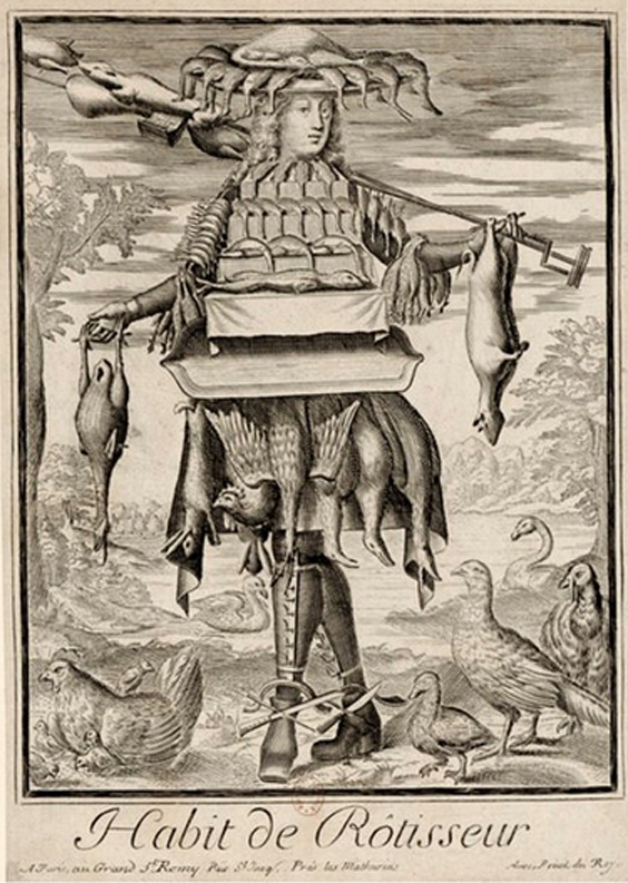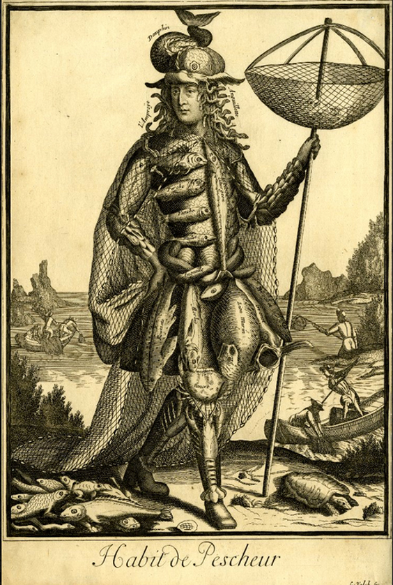 Sin embargo, desde tiempo atrás también han existido grandes visionarios de la vestimenta, así que si piensas que vestirse como una rebanada gigante de filet mignon es un artificio moderno, piénsalo dos veces. En el siglo XVII, el artista parisino Nicolás de Larmessin II a lo largo de su carrera, dibujó docenas de alegres y lunáticas caricaturas de personas extravagantemente ataviadas con elementos provenientes de la profesión que practicaban. ¿Qué tan extravagante?, tres palabras: traje de mariscada.