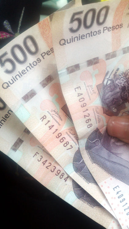 Al momento pactado, el reportero llegó al Salón Burócratas en la Zona Centro de Tijuana. Punto de reunión para la entrega de los billetes. Mucho movimiento, demasiada gente. Dado la soltura con que se entregaba, el manejo de papel moneda a raudales daba la impresión de ser falso. Pero no. Billetes reales de 500 pesos.