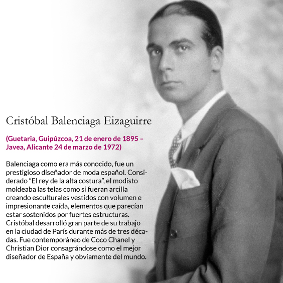 Balenciaga, nacido en Getaria (Gipuzkoa), España en 1895, se distinguió del resto de los diseñadores, pues no sólo hacía bocetos de sus creaciones sino que también los confeccionaba, así que tuvo amplio dominio de la costura y el manejo de los tejidos.