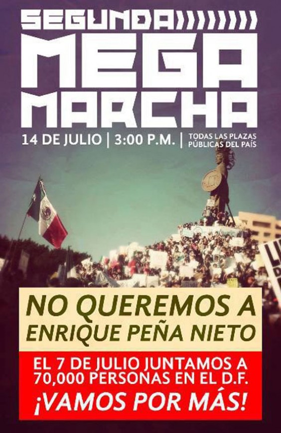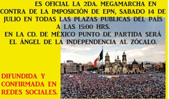 Movimientos independientes, como el #YoSoy132, y otros vinculados a la izquierda convocaron a través de redes sociales a la segunda #MegaMarcha para manifestar su rechazo a la imposición del virtual ganador de las elecciones presidenciales, Enrique Peña Nieto.