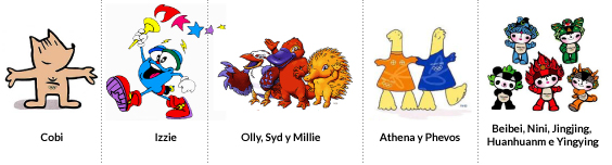 Para Beijing los chinos crearon a cinco mascotas: Beibei, un pez azul; Jingjing, un oso panda; Huanhuan, una antorcha roja; Yingying, un antílope tibetano; y Nini, una golondrina verde.