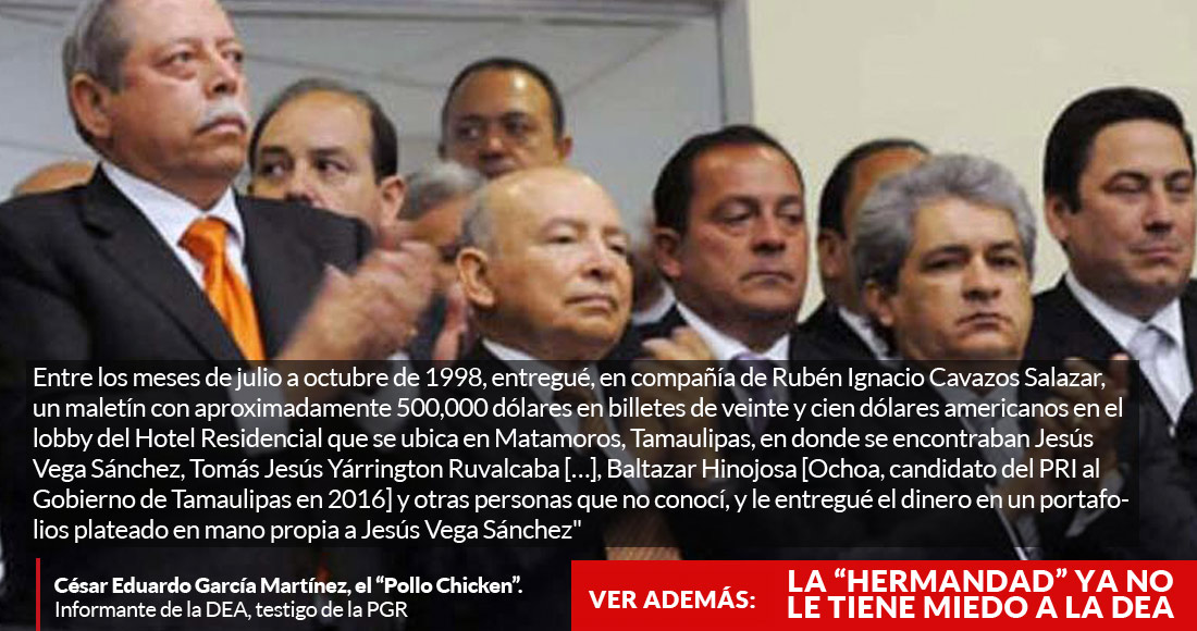 “Entre los meses de julio a octubre de 1998, entregué, en compañía de Rubén Ignacio Cavazos Salazar, un maletín con aproximadamente 500,000 dólares en billetes de veinte y cien dólares americanos en el lobby del Hotel Residencial que se ubica en Matamoros, Tamaulipas, en donde se encontraban Jesús Vega Sánchez, Tomás Jesús Yárrington Ruvalcaba […], Baltazar Hinojosa [Ochoa, candidato del PRI al Gobierno de Tamaulipas en 2016] y otras personas que no conocí, y le entregué el dinero en un portafolios plateado en mano propia a Jesús Vega Sánchez".