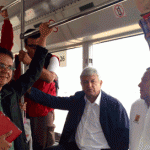 Ya en la Terminal 1 del Aeropuerto Internacional de la Ciudad de México, el candidato del Movimiento Progresista (PT, PRD, MC) avanza con dificultad: varias personas se le acercan; le llevan un pedazo de papel para que lo firme, o un libro; le pegan el cachete para tomarse una foto. Su hombre de prensa, César Yáñez, le carga la agenda y le platica al oído. AMLO, como se le dice de manera ordinaria, lo escucha mientras atiende a sus fans. Todos los que se le acercan le desean éxito y se despiden de mano.