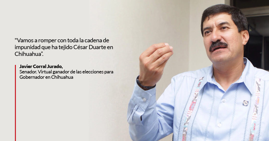 El candidato que aventaja en el conteo en Chihuahua, el panista, Javier Corral Jurado, aseguró que Chihuahua “será el estado que realmente toque el fondo del sistema de intereses y de complicidades que llevó al enriquecimiento del Gobernador [César Duarte Jáquez], para que se pueda liberarse una orden de aprehensión e inicié el proceso de recuperación de los bienes”, que Duarte habría adquirido con dinero público.