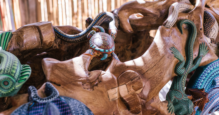 El plan fue comer con los ojos los paisajes de las carreteras oaxaqueñas en moto hasta llegar a un pueblo de unas cuantas calles, San Martín Tilcajete. Ahí estaba don Jacobo en su taller, con su voz tenue y de cierta manera plagada de paz en acento sureño. Es el artesano de alebrijes más famoso mundialmente. Unos chinos intentaron patentar su obra, ha estado expuesto en Alemania, en la India, en el Vaticano y hay coleccionistas de su obra en varios puntos del planeta.