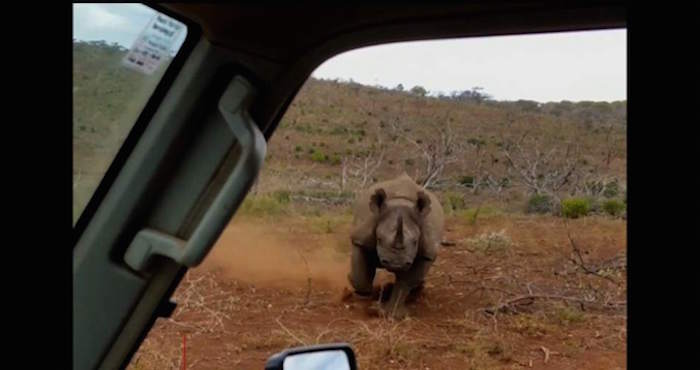 De pronto, el rinoceronte empezó a correr en dirección al jeep, haciendo creer que tiraría el auto. Sin embargo, el mamífero se detuvo a 20 centímetros del auto y se dio la vuelta.