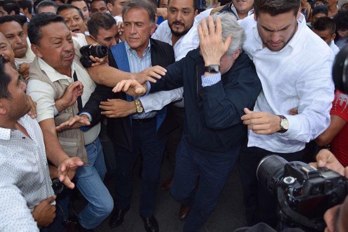 "Yunes represor" y "Asesino de campesinos", gritaban los campesinos.