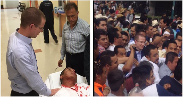"Fuimos brutalmente agredidos por enviados de Javier Duarte. No a la legalización de la corrupción. Ni un paso atrás!", escribió Ricardo Anaya en su cuenta de Twitter en donde además adjuntó tres fotografías.