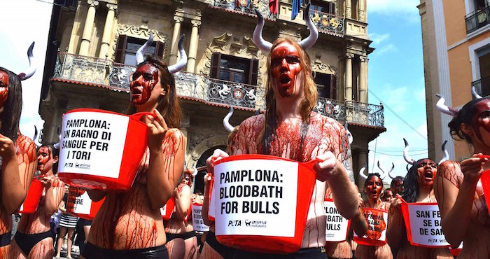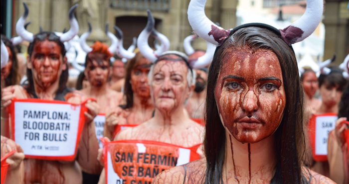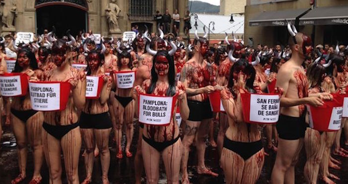 Los participantes se han desplazado a Pamplona desde Madrid, Barcelona, Valencia, Alicante, Estados Unidos, Suecia o Francia, para realizar un acto semidesnudos, con cuernos y bañándose en sangre artificial, para protestar contra el "maltrato animal", con el lema 'Pamplona se baña de sangre'.