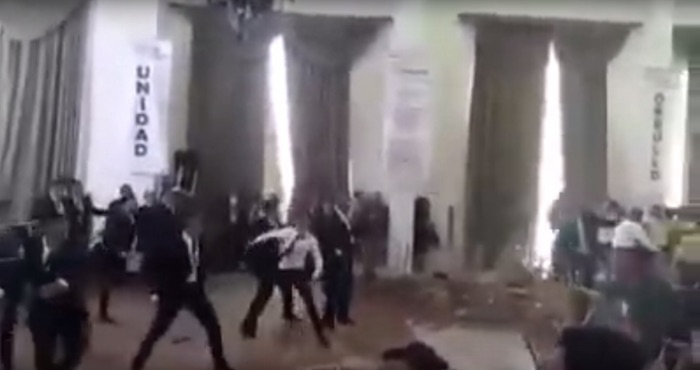 En un video compartido en redes sociales se observa cómo los elementos que resguardaban la Presidencia del Congreso Seccional y maestros disidentes se arrojan sillas y demás objetos que había en el lugar.