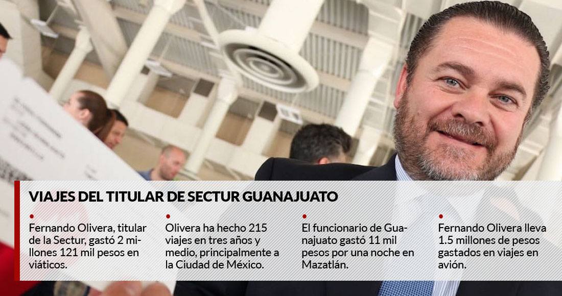 El gasto de viáticos se concentra en la figura del titular de Sectur de Guanajuato, Fernando Olivera, quien se ha llegado a gastar en un año hasta el 95 por ciento del recurso de la dependencia, como ocurrió en 2013. En tres años y medio, ha gastado en viáticos 2 millones 121 mil pesos en los 215 viajes que realizó y ha llegado a pagar más de 11 mil pesos por una noche de hotel en Mazatlán, Sinaloa. En promedio, a lo largo de su cargo, Olivera ha dispuesto de forma personal de casi el 40 por ciento de los gastos de representación de su dependencia.