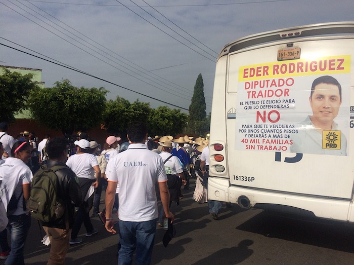Antes los protestantes se detuvieron unos minutos frente al Congreso del Estado, en donde decenas de personas se manifestaron con pancartas y consignas en contra de los diputados, que acusan, son dominados por el poder Ejecutivo.