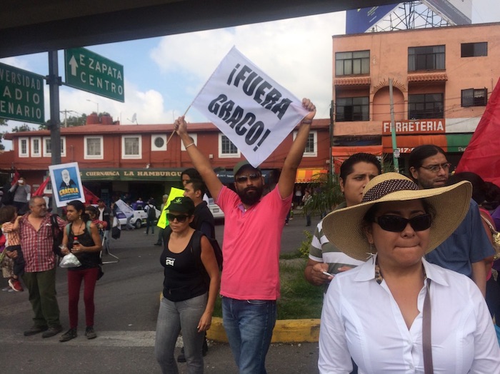 Después de la marcha de miles de ciudadanos que exigen la renuncia del Gobernador de Morelos, Graco Ramírez Garrido Abreu, habrá un plantón indefinido frente al Palacio de Gobierno para exigir que el perredista "salga y dé la cara". La inseguridad es un problema que nos está afectando a todos y por otro lado se ha usado la mentira como forma de intimidación, dijo el Rector Alejandro Vera Jiménez.