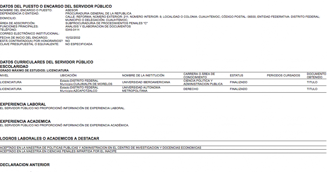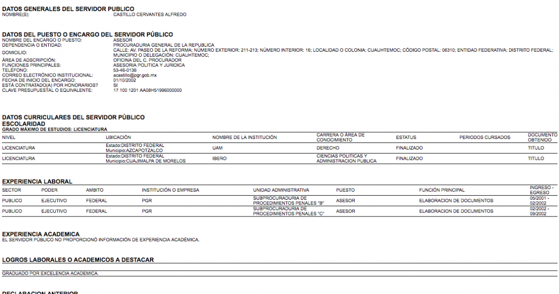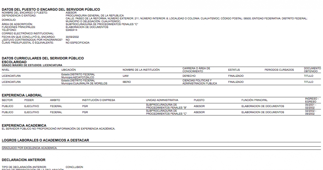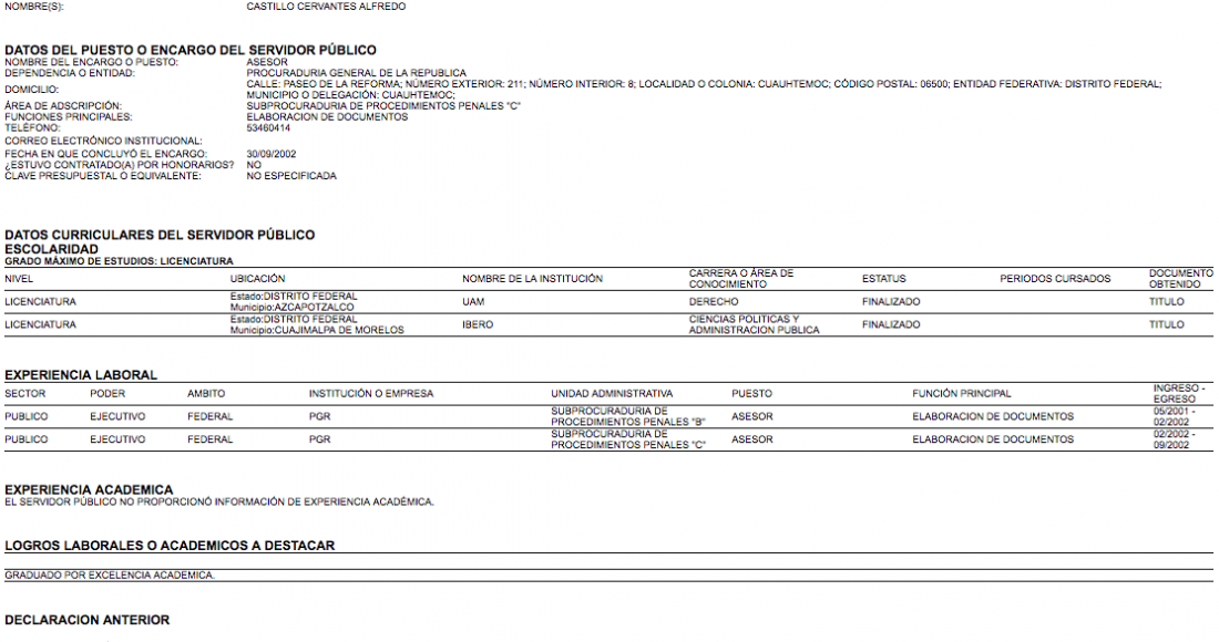 2.- 15 de noviembre de 2002 (Asesor de la PGR).- Incluye su currícula académica y laboral que hasta ese momento sólo tiene dos cargos de asesor, uno en la Subprocuraduría de Procedimiento Penales “B” y otro en la Subprocuraduría de Procedimientos penales C. Como logro laboral o académico destaca que se graduó por excelencia académica.