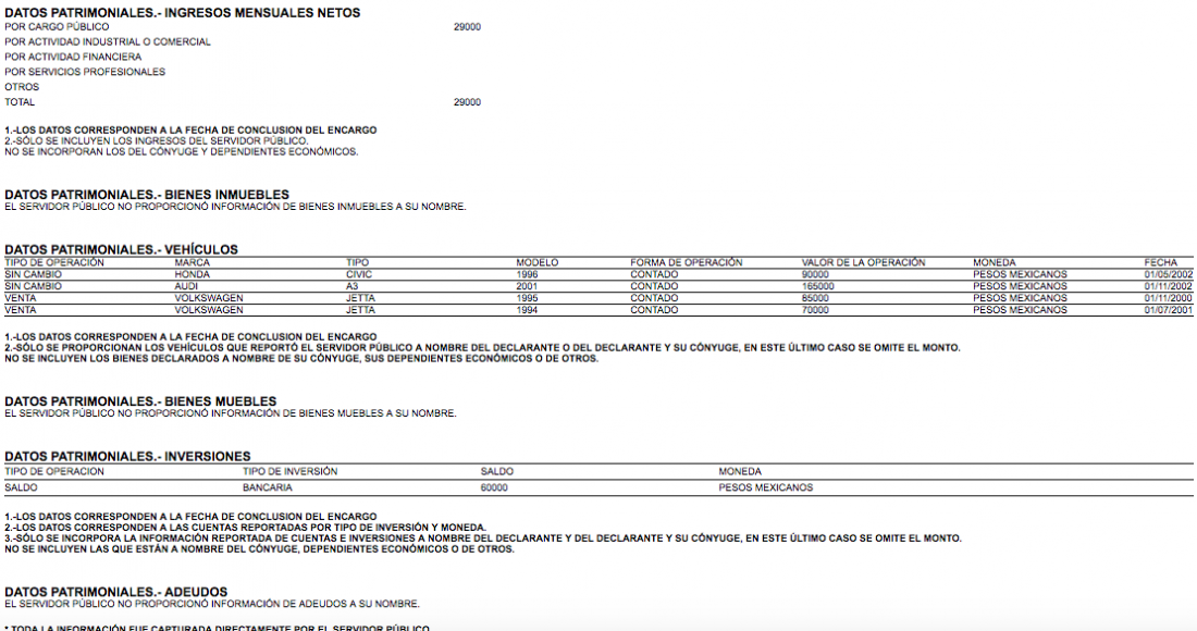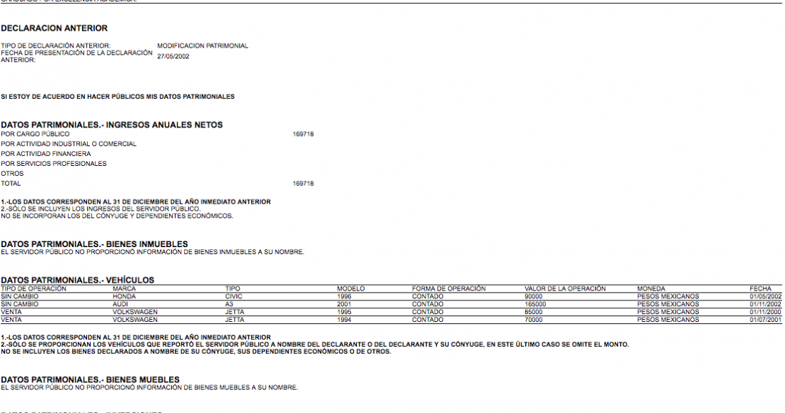 3.- 28 de mayo de 2003 (Asesor en la PGR).- Incluye su currículum laboral y añade cuatro vehículos de las marcas Honda, Audi y Volkswagen. Los pagó al contado. Uno le costó 90 mil pesos, otro 165 mil pesos, otro 85 mil y uno más 70 mil. Los compró en 2000, 2002 y 2001. Dice también que ese año, sus gastos de manutención ascendían a 160,000 pesos.