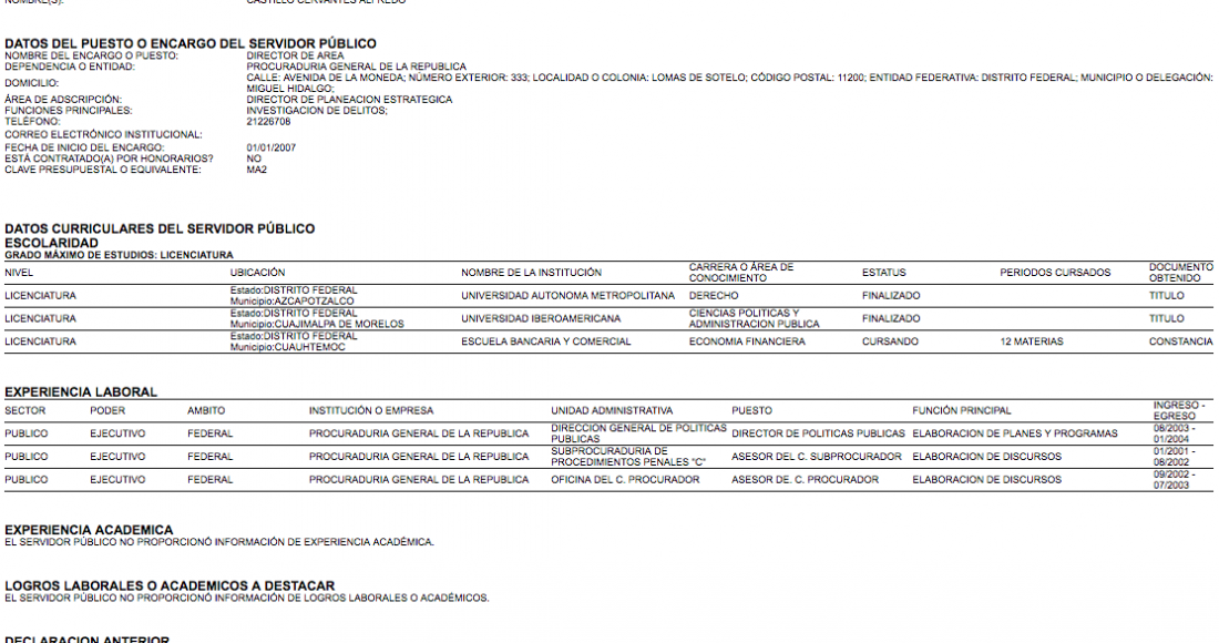 7.- 16 de enero de 2013 (Subprocurador de la PGR).- No acepta hacer públicos sus datos patrimoniales. Presenta su currícula académica y laboral.