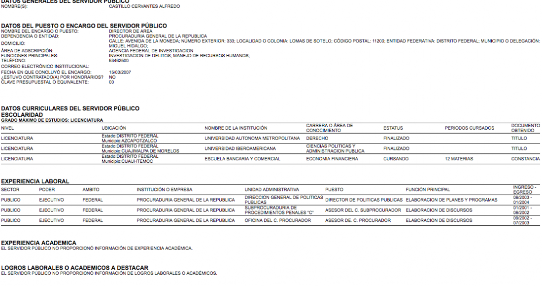 6.- 14 de mayo de 2007 (Director de Área de la PGR).- No acepta hacer públicos sus datos patrimoniales. Presenta su currícula académica y laboral.