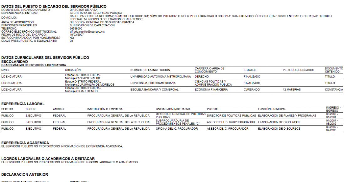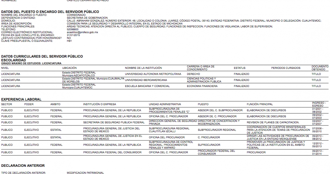 Casi diez millones de pesos ha devengado Alfredo Castillo Cervantes en lo que va del sexenio de Enrique Peña Nieto en los cuatro cargos que ha ocupado, según la información del Portal de Obligaciones y Transparencia, así como los registros del Sistema Integral de Recursos Humanos y Nómina de la Secretaría de Gobernación. Se trata de un funcionario que ha pedido rendición de cuentas en cada una de las posiciones por las que ha pasado. Pero él, aunque ha presentado ocho veces su declaración patrimonial, no ha brindado ningún dato de su fortuna. En cada una de sus declaraciones ha dejado claro que su currículum ha crecido. Pero en todas, el funcionario ha suscrito la frase: “El servidor público no acepta hacer públicos sus datos patrimoniales”.