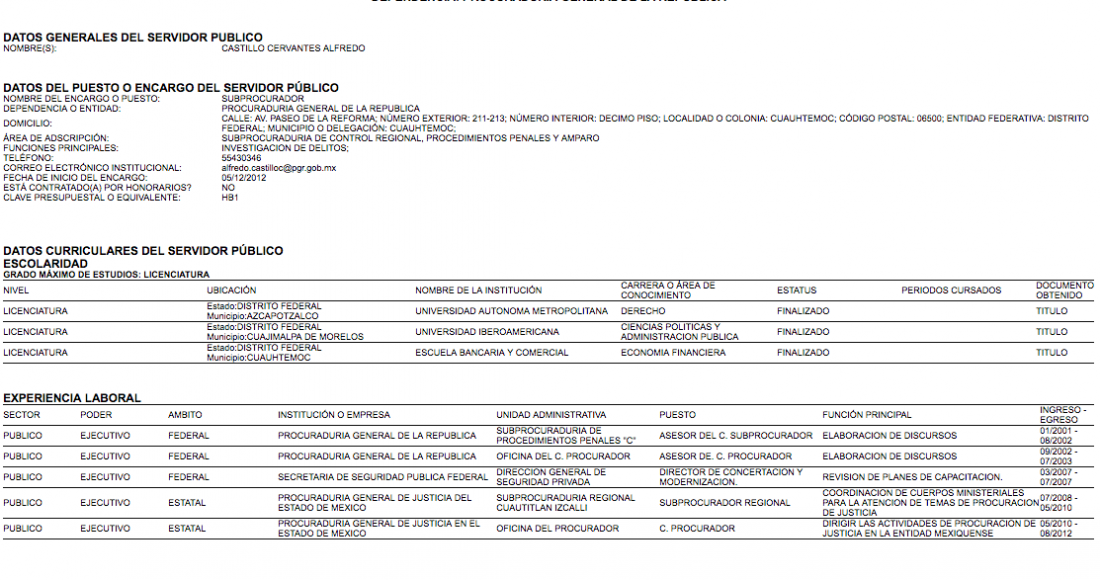 Ese cargo, Castillo Cervantes lo tuvo de diciembre de 2012 a mayo de 2013. Se le pagó tres millones 310 mil 41 pesos, según el POT, que indica un sueldo bruto para ese cargo de 171 mil 41 pesos al mes.