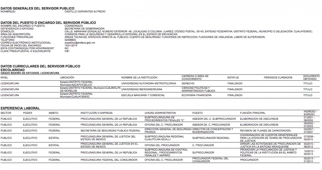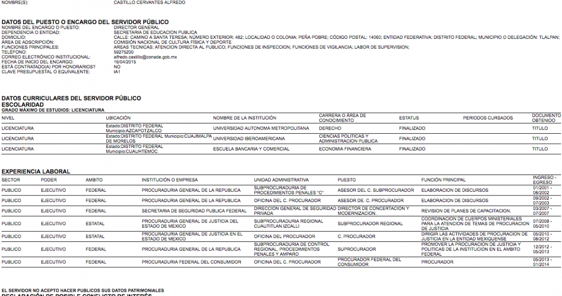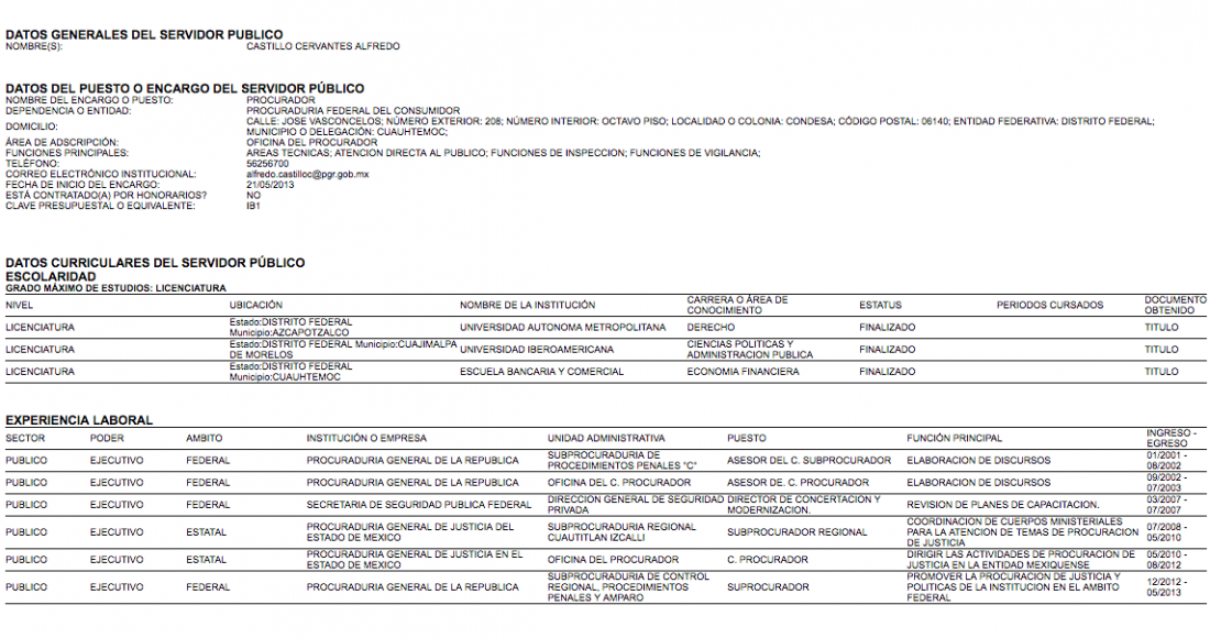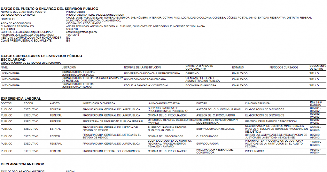 10.- 16 de marzo de 2014 (Procurador Federal del Consumidor).- No acepta hacer públicos sus datos patrimoniales. Añade cargos a su currículum laboral.
