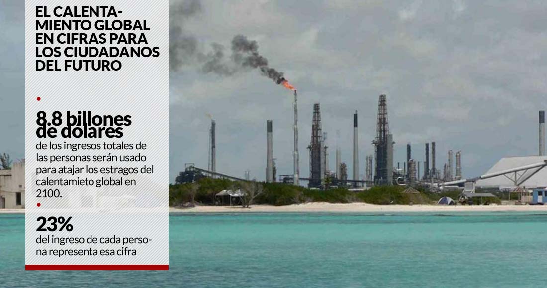 "La generación millennial perderá aproximadamente 8.8 billones de dólares (cerca de 162 billones de pesoen los ingresos totales de los individuos si no somos capaces de actuar ante el cambio climático", según un nuevo informe de la organización NextGen Climate, titulado "The Price Tag of Being Young" ("El precio de ser joven"). El informe de NextGen se basa en una proyección de la Universidad de Berkeley de octubre de 2015, la cual señaló que el ingreso promedio de una persona en el año 2100 será 23 por ciento menor de lo que sería en un mundo sin calentamiento global. Según el informe, tan sólo en Estados Unidos habrá una pérdida relativa del 5 por ciento de los ingresos para el 2050, seguido de un aumento drástico que elevará la cantidad a un total de 36 por ciento para el 2100.