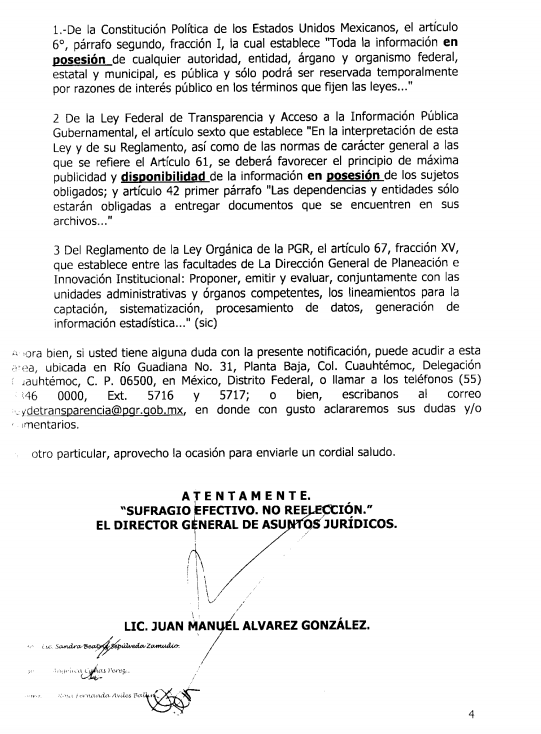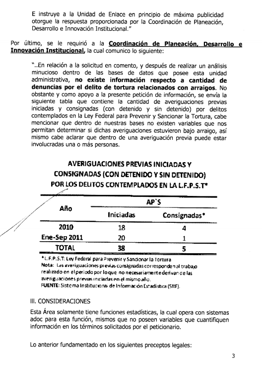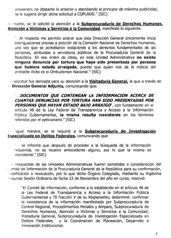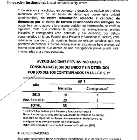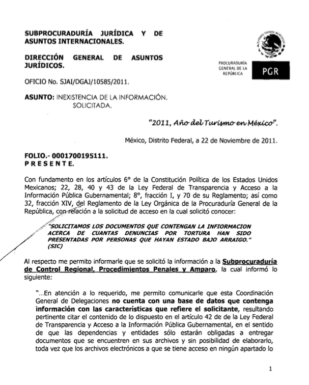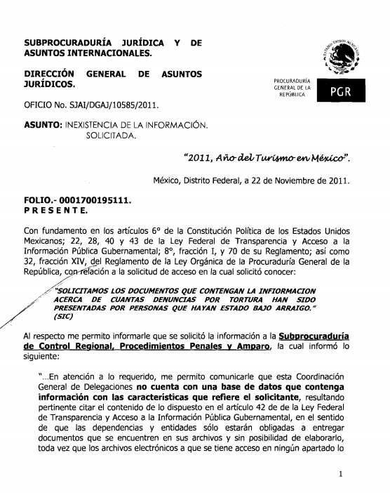 Un ciudadano pidió a través del entonces IFAI (hoy INAI) el número de personas procesadas por el delito de tortura entre enero de 2009 y septiembre de 2011. La respuesta de la Subprocuraduría Jurídica y de Asuntos Internacionales de la PGR fue que “no se encontraron antecedentes referentes a la información solicitada” en las zonas centro, sureste, Occidente, Noroeste. Esa vez, dijo que en la zona Noreste hubo un procesado. De modo que de 2009 a 2011 la PGR reconoció sólo un procesado por el delito de tortura.