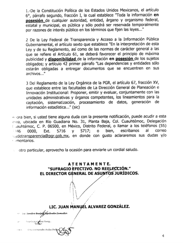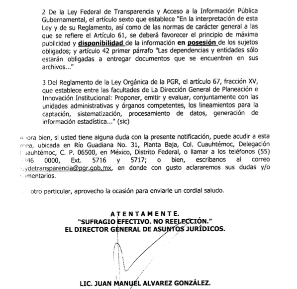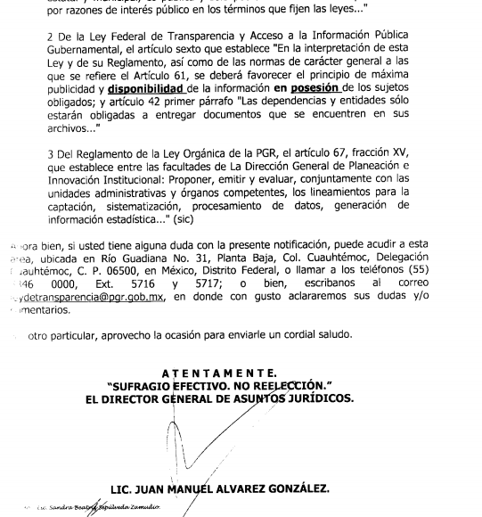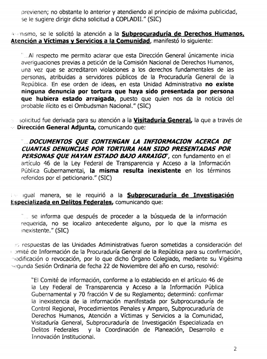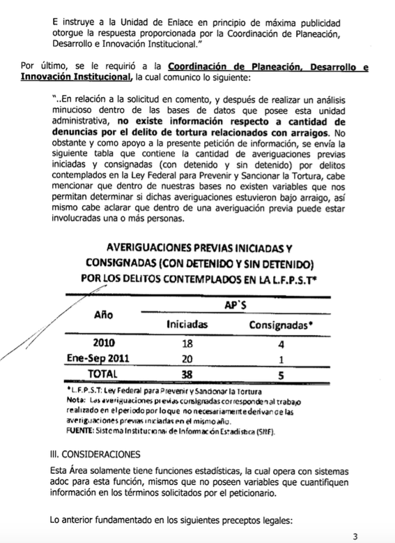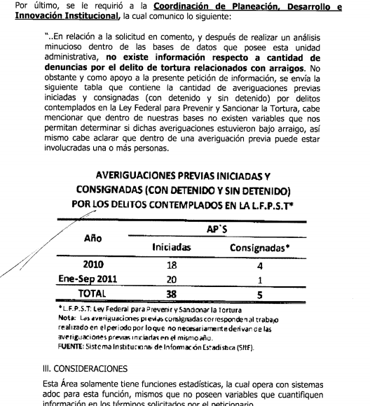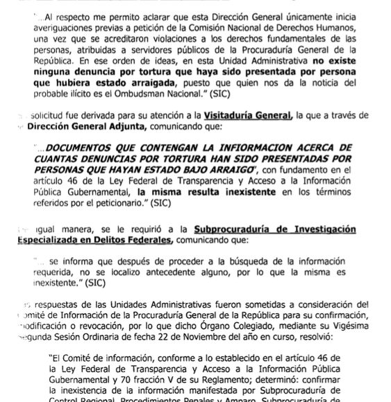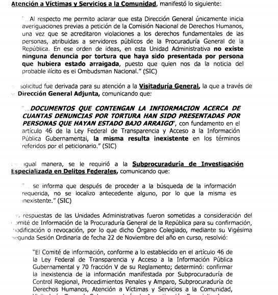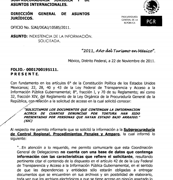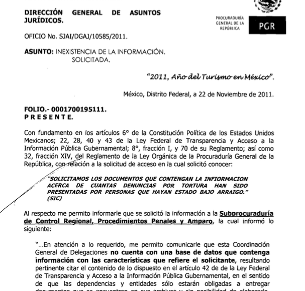 Tampoco tuvo la PGR, ese mismo año, la información del número de denuncias por tortura presentadas por personas que hubieran estado bajo arraigo. La Subprocuraduría de Control Regional, Procedimientos Penales y Amparo informó a través del entonces IFAI que no contaba con una base de datos que contuviera esa información y la declaró “inexistente”.
