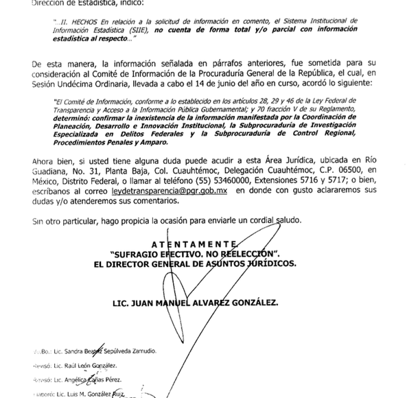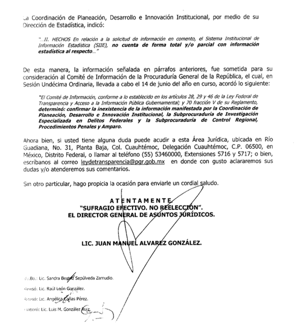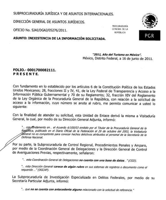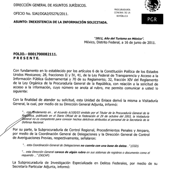Pero en 2011, cuando la guerra había alcanzado 15 mil muertos, la misma Subprocuraduría declaró inexistente en sus archivos el número de casos de denuncia de tortura atribuidos al personal de la Sedena; es decir a miembros del Ejército. Las razones para negar esta información fueron que no contaba con una base de datos en la Coordinación General de Delegaciones; además de que el Sistema Institucional de Información Estadística (SIIE) no tenía ni en forma total y/o parcial información estadística al respecto.