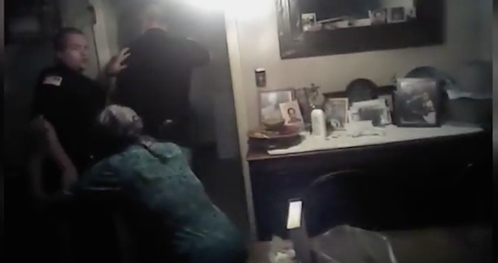 La grabación también muestra cómo la anciana cae al piso luego de perder la visión a causa del gas pimienta, tras lo cual, los agentes la esposan y la sacan del domicilio. Otra cinta muestra a su hijo siendo sometido con una pistola eléctrica a pesar de que no se resistió al arresto y se encontraba de pie con las manos en el aire.