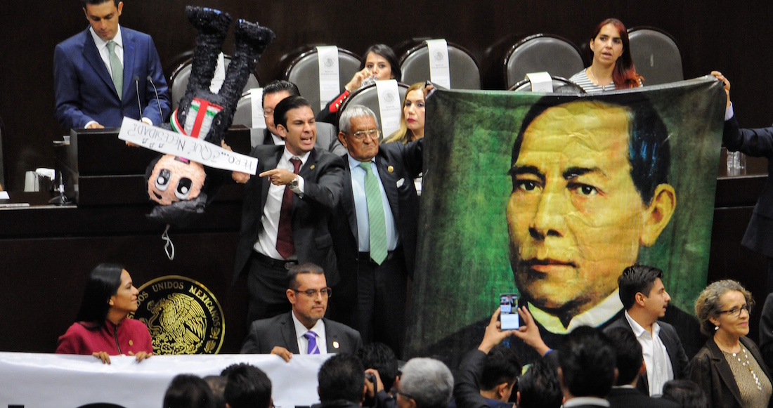 Los diputados de Morena, PRI y PVEM armaron un zafarrancho en el pleno de la Cámara de Diputados por una lona contra el muro de Donald Trump y la reunión que sostuvo con Enrique Peña Nieto.