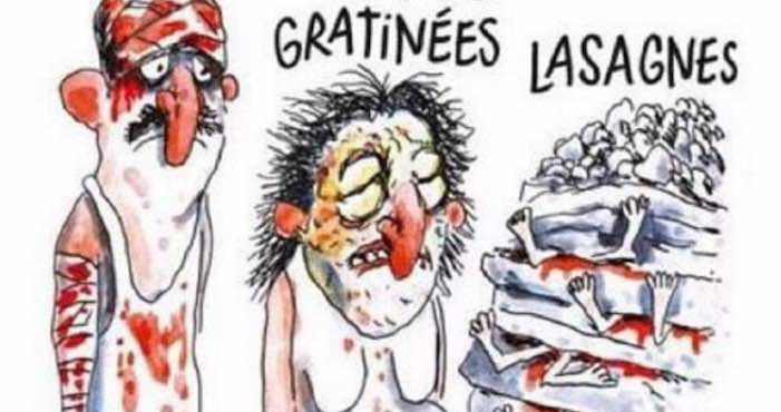 La revista francesa publicó en su más reciente edición un dibujo de víctimas del terremoto cubiertas de escombros o heridas con nombres de comidas típicas italianas como penne con salsa de tomate o lasaña. El título del dibujo era "sismo a la italiana".