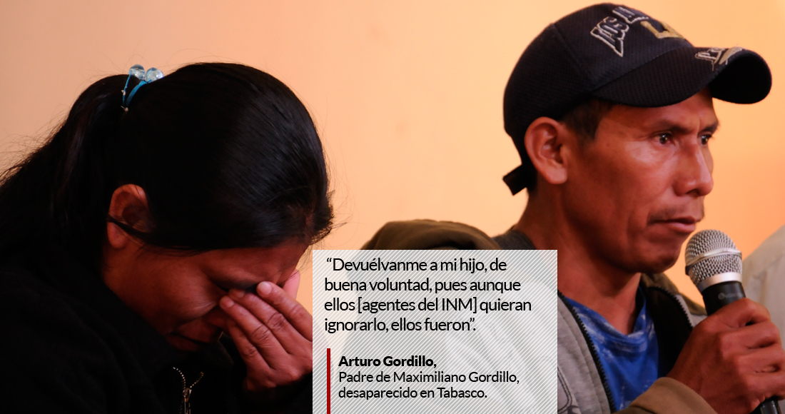 En mayo pasado, Maximiliano Gordillo Martínez, originario de la comunidad Tzinil, en el municipio de Socoltenango, en Chiapas, fue detenido por agentes de migración en los límites de Tabasco con Campeche supuestamente al ser confundido con un migrante centroamericano. El Instituto Nacional de Migración negó haber realizado una detención en la fecha referida. Tras casi cuatro meses de haber realizado intensa búsqueda y de exigir a las autoridades una investigación, el joven de 19 años de edad volvió con su familia. Este caso se suma a los más de 150 incidentes en los que civiles chiapanecos han desaparecido en territorio nacional durante migraciones internas.