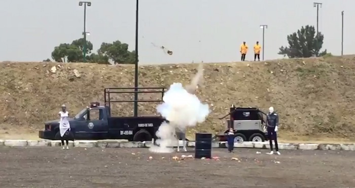 En las imágenes se observa como los elementos de la dependencia utilizaron un maniquí para ejemplificar, y fue colocado a lado de un tambo que contenía fuegos pirotécnicos, al momento de encenderlo la explosión que se generó fue impactante.