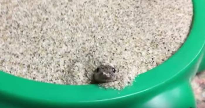 Acto seguido Jenny la acerca a la arena, y sin dudarlo, Waffle comienza a perforar la superficie para desaparecer entre la gravilla, para minutos después y al otro extremo del orificio de ingreso, colar la cabeza de entre el polvillo para lucir sus minúsculos y tiernos "ojitos negros".