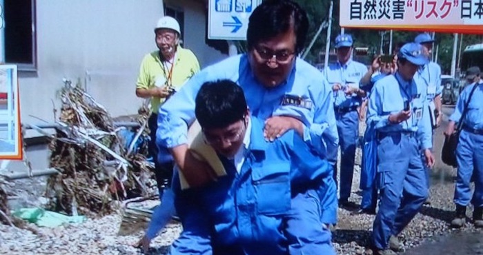 Shunsuke Mutai, Viceministro de Reconstrucción de Japón olvidó llevar botas de goma y apareció en imágenes televisadas subido a la espalda de otro funcionario que vadeaba el charco. La escena provocó fuertes críticas en medios sociales, donde se acusó al funcionario de no tomarse en serio su trabajo.