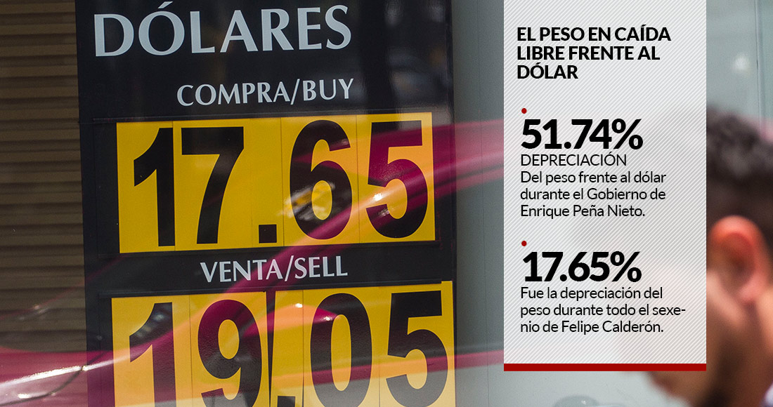 Entre el inicio de la actual administración y hoy, la moneda mexicana se ha depreciado 51.74 por ciento frente al billete verde ofertado en bancos.