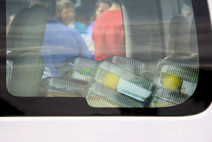 Los azules subían y bajaban. Algunos se quedaron sentados en el interior del transporte. Sus lunches incluían fruta (manzana, plátano o naranja), agua o refresco, galletas y pan. Pero algunos preferían comprarse sus propios alimentos como un par de policías que, parados, terminaban su comida china en platos de unicel.