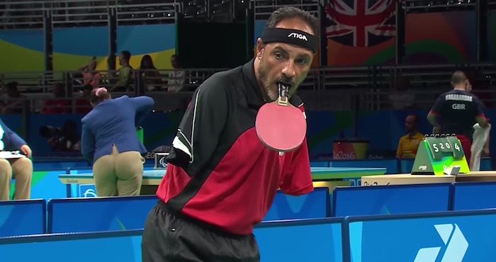 La paleta de Ibrahim Hamadtou está apoyada sobre la mesa. Su mango de madera, cubierto con cinta aisladora negra, sobresale de los límites de la cancha cuatro de Riocentro; una de las sedes de los Juegos Paralímpicos de Río de Janeiro. En breve, el egipcio inclinará su torso y agarrará la paleta con su boca. En simultáneo, el público se acomoda en la tribuna.