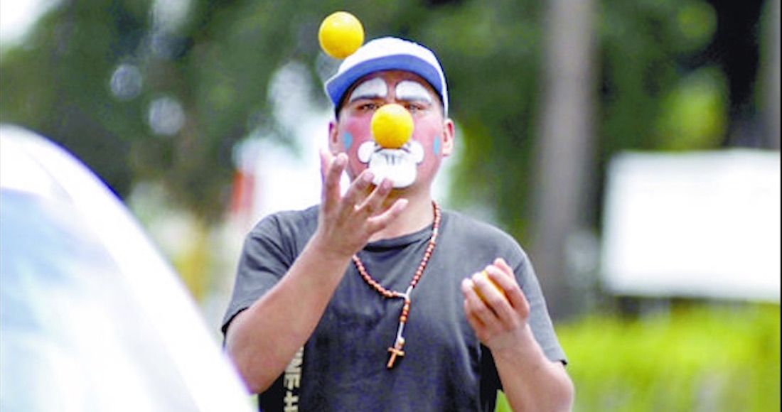 Payasos tristes, malabares con naranjas y flamas con gasolina, era lo que pagaban por ver, durante 45 segundos, los automovilistas de la desquiciada ciudad, por ayudarlos a distraerse un poco del tráfico, y les brindaban, por el riesgo a los artistas, una moneda.